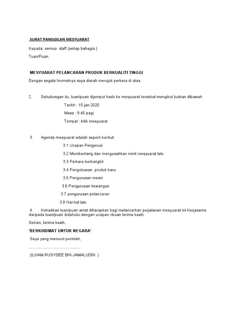 16cik nur athirah bt abd aziz lampiran 2 2 agenda mesyuarat jawatankuasa panitia bahasa melayu bilangan 1 2017 tarikh. Contoh surat jemputan mesyuarat masjid contoh surat. 3.1 ucapan pengerusi 3.2 membentang dan mengesahkan minit mesyuarat lalu 3.3 perkara berbangkit 3.4 pengurusan . Contoh surat panggilan hadir ke perjumpaan. Contoh minit mesyuarat kata kata. Contoh format surat panggilan mesyuarat.